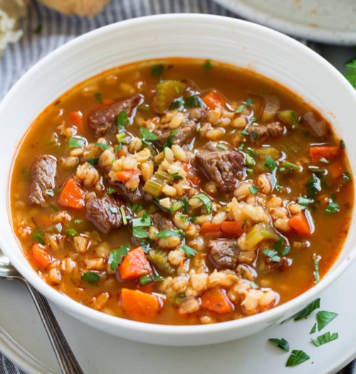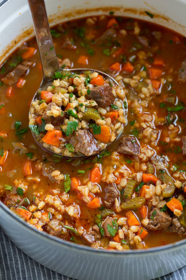 Rich and hearty homestyle beef barley soup recipe. Made with tender chunks of beef roast, nutritious whole grain barley, fresh veggies, and a deliciously seasoned broth. A soup that’s sure to warm the stomach and soul on those chilly Autumn days!